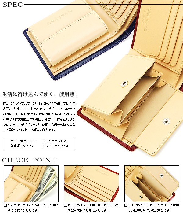 札入れ(中仕切り付)・ホック式小銭入れ(中仕切り付)・カードポケット×4・フリーポケット×2