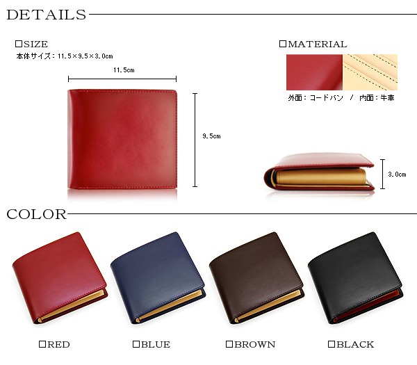 ユナイテッドオム プレジデント United HOMME President カラーコードバン 二つ折り財布 UHP-1032NV ブルー  商品仕様:(約) 縦9.5cm×横11.5cm×マチ3cm 表面/コードバン(馬革)・内部/牛革・PVC(内張り) 専用BOXメンズ札入れ(中仕切り付)・ホック式小銭入れ(中仕切り付)・カードポケット×4・フリーポケット×2