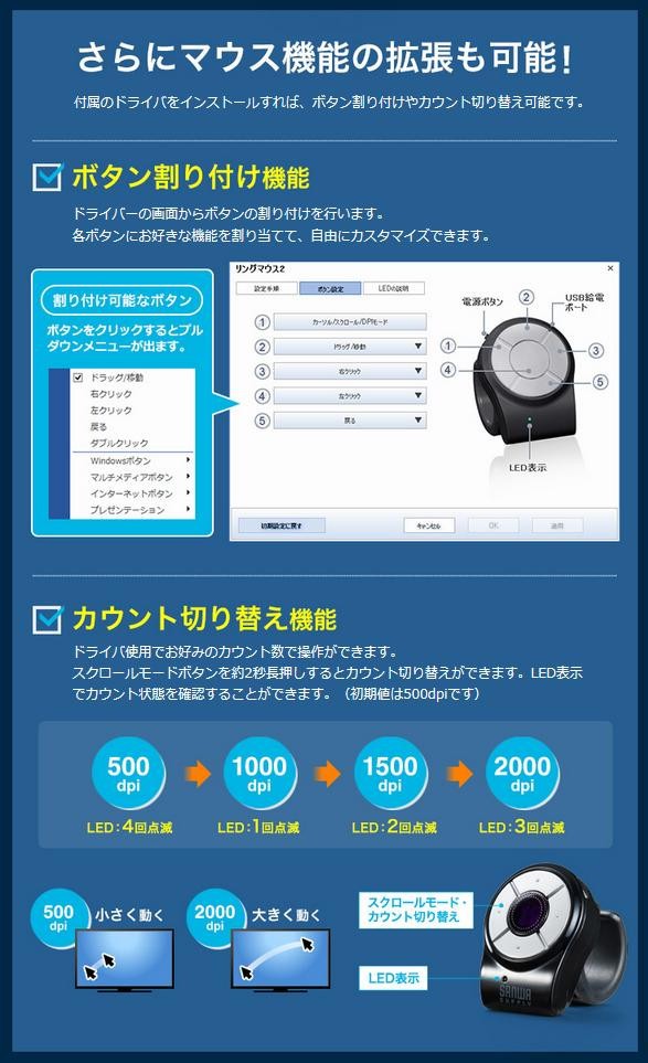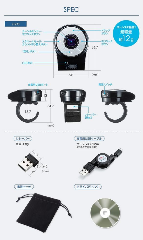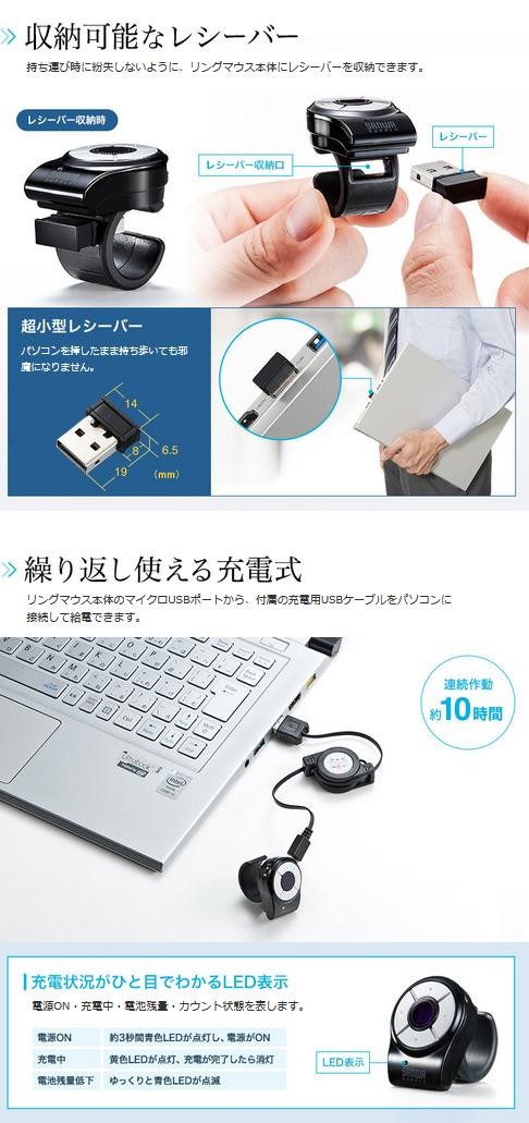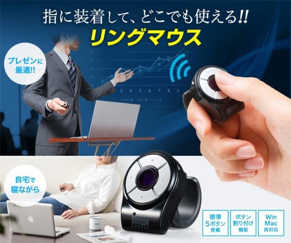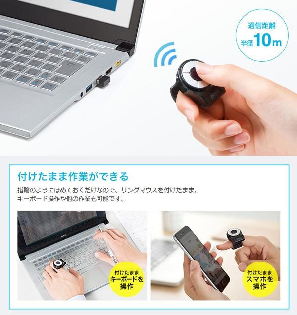 指輪のようにはめておくだけなので、リングマウスを付けたまま、キーボード操作や他の作業もできます。指に装着して操作するので、ソファやベッドに寝転がりながら簡単にパソコンを操作することができます。 |