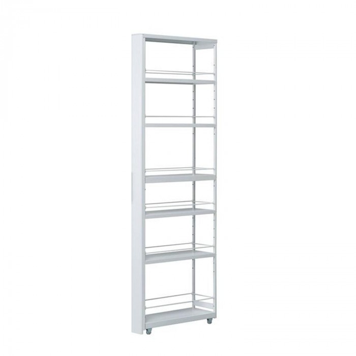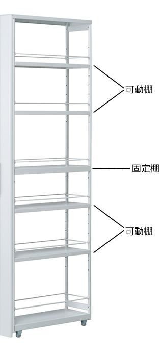 | ティッシュやシャンプーサイズの隙間を有効活用!!キッチンやサニタリーの隙間に大容量の立体収納ができます。可動棚4枚は、5cm間隔で高さ調節が可能。取っ手とキャスター付なので出し入れも簡単です。 |