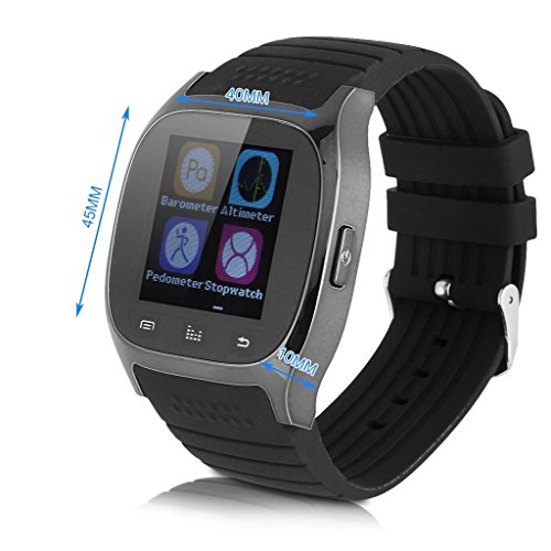 This is a new Bluetooth Smart M26 Watch which is compatible with all Bluetooth V3.0(Minimum version 3.0) or above enabled smartphones, tablets and PCs (support Android 2.3 or above), such as iPhone 4, 4S, 5, 5S, Sumsung S3, S4, Note 2, Note 3, Note 4 etc. Features 1.48" Capacitive Touch Screen TFT LCD Time/Date/Week/Battery state display Ringing reminder when you receive a call Ringing reminder once your mobile phone disconnected Display the number or name of incoming calls Answer or Dial calls from watch Support hands-free calls, phone book Play the music in your phone Sync SMS/call history(only for android phone, you need download apk) Ring reminder when your smart phone receive a message (including Wechat, Facebook, Twitter, WhatsApp, Skype, and so on. Only for android phone.) Anti-lost alarm function: When cellphone left watch alarm automatically, after a certain distance to avoid lose the phones Remote taking photo function: You can control your cellphone to take photo from the watch. (only for android phone) Stopwatch, Altitude Meter, Passometer, Photograph, Barometer, Vibration Bluetooth Version: V3.0+EDR Bluetooth Protocol: A2DP + HFP 1.5 + HS P 1.2 Range of Frequency: 2.4GHz spectrum Ambient Noise:dB Transmitting Range:10mFeature
