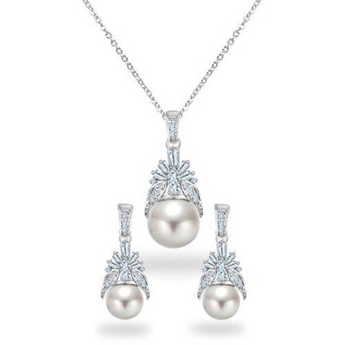 -. Title : Bling Jewelry CZ Simulated Pearl Drop Necklace Earrings Set Rhodium Plated