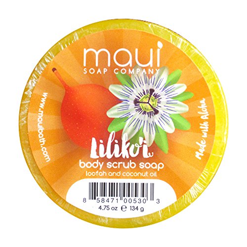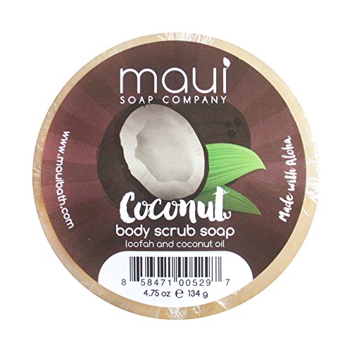 Maui Soap Co. Coconut body scrub made with glycerin and coconut oil. Each soap has a tropical loofah slice embedded into the soap for gentle exfoliation. Made in Maui, Hawaii.