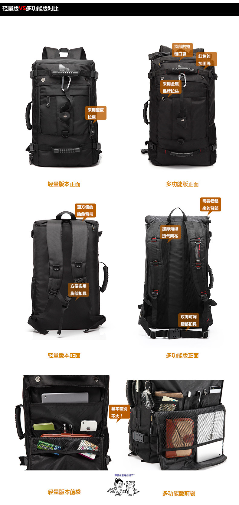 1. lightweight version [version less than Multifunctional top and bottom zip pocket cushioning sponge + breathable mesh back and waist lightweight zippered pocket] key advantages: more portable and convenient for everyday use feature rich use hidden zipper shoulder strap!