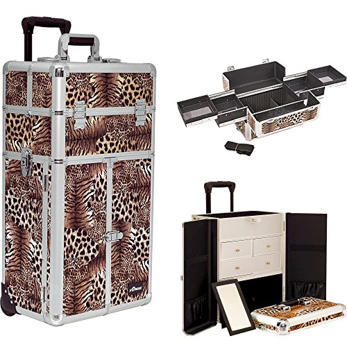 " Sunrise I3165LPBR Professional Rolling Aluminum Cosmetic Makeup Craft Storage Organizer Case French Door Style with Split Drawers and Easy-Slide Trays, Leopard"