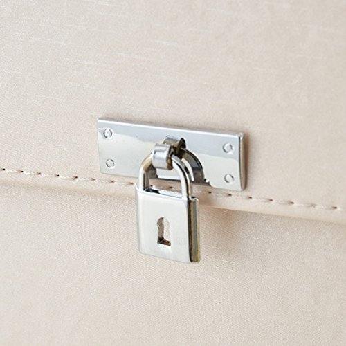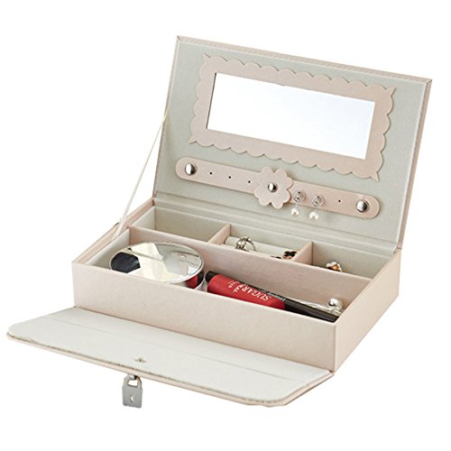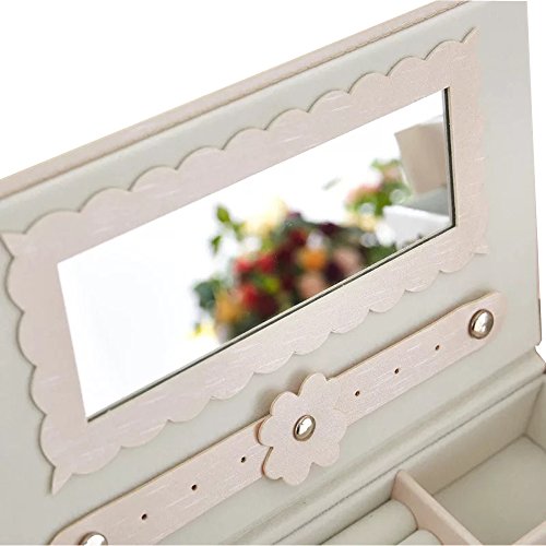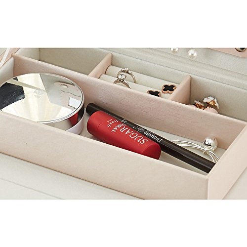 Mirror in the lid for easily make-up and dress-up when opening the jewelry box. 1 earrings belt under the mirror to keep your earrings. 1 large component for necklace or some cosmetic like lipstick; 2 small components for storage of small gadgets with the middle rolls for keeping rings