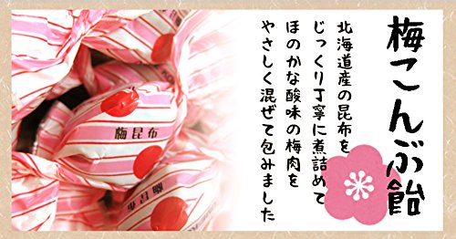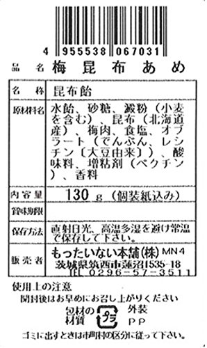 原材料:水飴、砂糖、澱粉(小麦を含む)、昆布(北海道産)、梅肉、食塩、オブラート(でんぷん、レシチン〔大豆由来〕)、酸味料、増粘剤(ペクチン)、香料