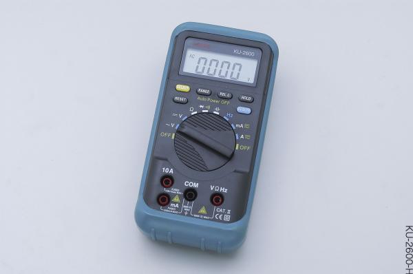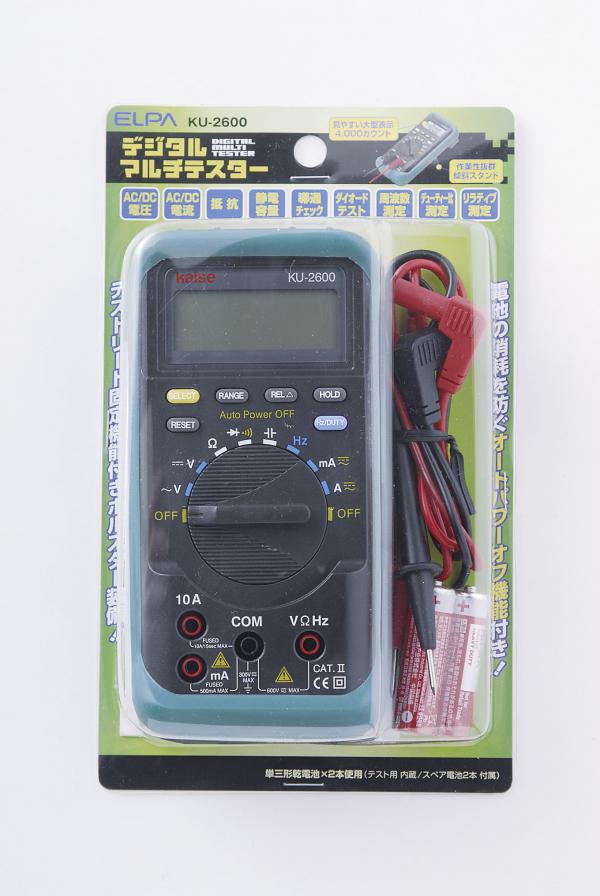 レンジホールド、偏差測定機能。データホールド機能付き。電池の消耗を防ぐオートパワーオフ機能。テストリード固定機能付彫るスターを搭載。サイズ/2.9×7.5×15.5cm 重量/180g 素材・材質/ABS 付属品/取扱説明書、保証書(保証期間1年) 製造国/中国 ※サプライヤー直送品 ご注文後3~4営業日後の出荷となります【商品名】デジタルマルチメーター KU-2600