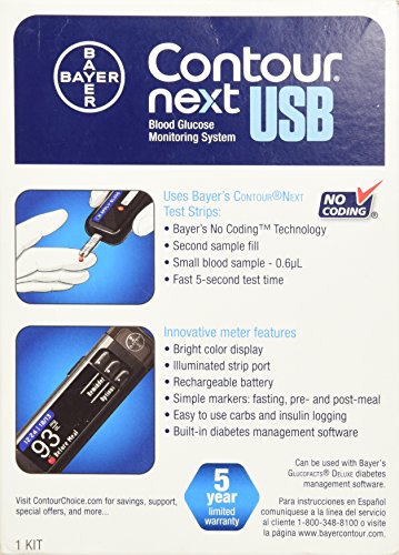 -. Brand : Contour -. Feature : MULTIPULSETM accuracy technology from Bayer ensures highly accurate glucose measurements, even when blood glucose levels are low / No CodingTM technology eliminates inaccurate results due to a user miscoding. Autolog prompts for fasting as well as pre- and post-meal markers to help organize your results / Built-in GLUCOFACTS® DELUXE software lets you check results on the meter or on a computer, Connects directly to a computer for instant access to test results and trends, as well as recharging the battery / An electronic logbook with more information helps foster more productive conversations with your doctor / Second-ChanceTM Sampling allows you to apply more blood to the same test strip to help prevent wasted test strips -. Label : Contour -. Manufacturer : Contour -. MPN : blood glucose meter -. PartNumber : blood glucose meter -. ProductGroup : Health and Beauty -. ProductTypeName : PERSONAL_CARE_APPLIANCE -. Publisher : Contour -. Studio : Contour -. Title : Bayer Contour Next USB blood Glucose Monitoring System