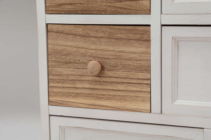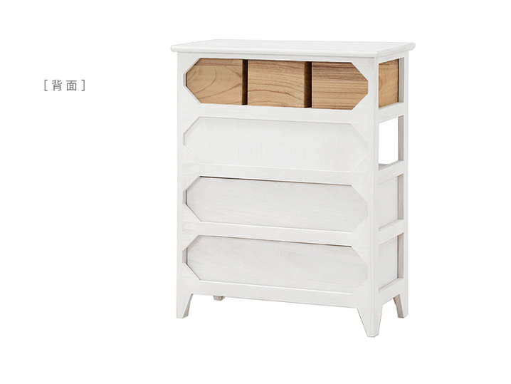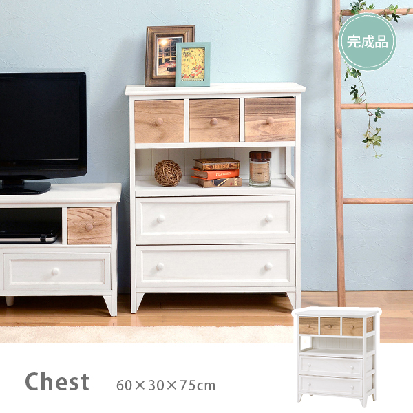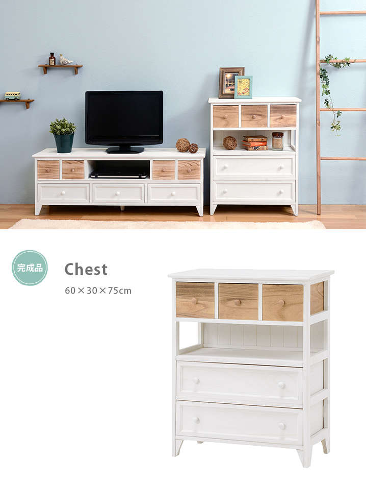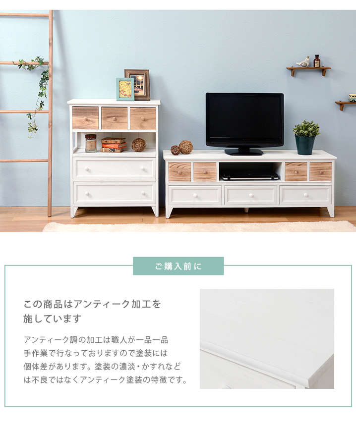 ●たっぷり収納できる、シンプルなアンティーク調チェスト。ブラウンの引出しがアクセント。