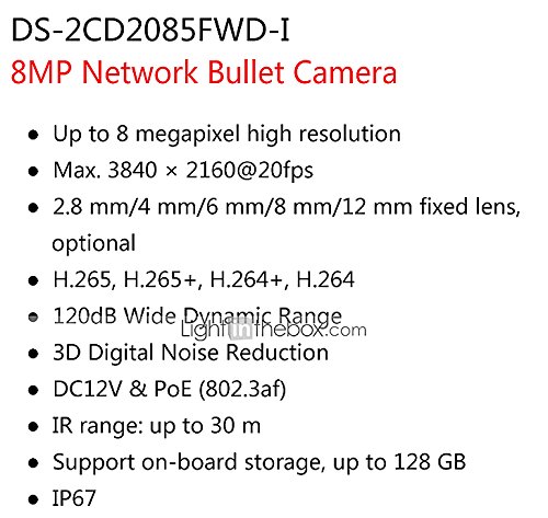 -. Title : HIKVISION DS-2CD2085FWD-I 8MP IP Camera(12 VDC & PoE IP67 30m IR Built-in SD Slot H.265 3D DNR Motion Detection)
