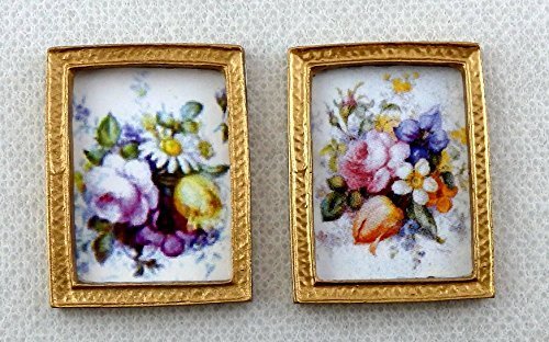 Melody Jane Dolls Houses House Miniature Accessory 2 Flower Pictures Paintings In Gold Frames b...