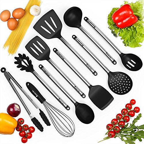 IMPROVED DESIGN AND EASY MAINTENANCE. We made the starter kitchen utensil set more comfortable and easy to use. We have increased the width of all kitchen spatulas, so your food won`t fall or get damaged. You can easily wash your egg whisk because of its special shape. /✅