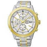 Stainless steel case with a two-tone (silver and gold-tone) stainless steel bracelet. Fixed gold-tone bezel. Silver dial with gold-tone hands and index hour markers. Minute markers around the outer rim. Dial Type: Analog. Date display at the 3 o'clock position. Chronograph - three sub-dials displaying: 60 second, 60 minute and 1/10th of a second. Quartz movement. Scratch resistant Hardlex crystal. Solid case back. Case diameter: 43 mm. Case thickness: 10 mm. Round case shape. Band width: 19 mm. Band length: 8 inches. Fold over clasp with push button release. Water resistant at 100 meters / 330 feet. Functions: chronograph, date, hour, minute, second. Casual watch style. Seiko Chronograph Silver Dial Two-tone Mens Watch SKS432.Feature