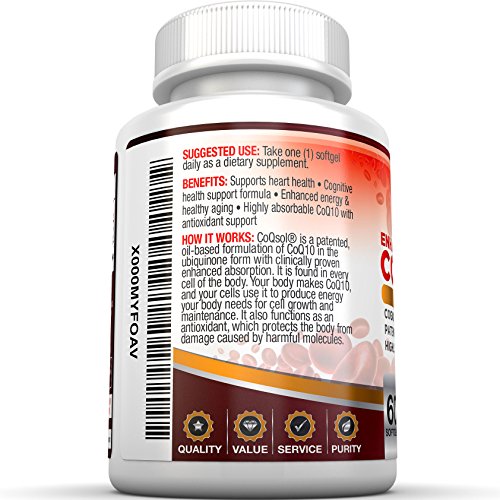 -. Binding : Health and Beauty -. Brand : BRI Nutrition -. EAN : 0616320074180 -. Feature : ★WHY US: We have a PROVEN and PATENTED COQSOL® that has a 2.6x Higher Total CoQ10 Absorption than normal COQ10. In our study, A full 83% of subjects in the CoQsol® group noticed an increase in energy over normal COQ10. / ★WHAT IT IS: Ageing is not a problem that only our outer appearances face. More than our skin, wrinkles, or fine lines, our bodies are give way to tired muscles or overworked cells. Our systems do not function as much as they usually do and day by day our bodies deteriorate. However, COQ10 is a revolutionary supplement that uplifts the cells in the body by increasing energy production all over the body, and even strengthens our cardiovascular systems in the process. / ★PURITY: 100% safe and natural. No fillers or artificial ingredients. We use only the very best, scientifically-tested ingredients, all of which are manufactured in our US, FDA-inspected, state-of-the-art, facility, with strict adherence to good manufacturing practices. Every batch is third party tested to ensure that we only utilize ingredients that are safe and pure. / ★CONTINUED: In fact, it has shown potency in treating high blood pressure or hypertension. Further studies made on COQ10 also reveals that it contributes to brain health, and protection of our cells from free radicals.COMMON NAMES: COQ10 is a short term for Coenzyme q-10. You may come across the two forms as well of COQ10: ubiquinol and ubiquinone, both of which play essential roles in various processes throughout the body. / ★SHARE:Consider ordering one bottle for yourself and another for a friend or loved one. Keep each other motivated and reach your goals together and more quickly. BRI Nutrition stands by every quality product they make. We manufacture only premium and extra pure but high potency vitamins, capsules, pills, tablets, powders, multivitamins, supplements, topicals liquids, serums, vegan foods, and natural organic-based extracts for men, women, and children. Check BRINutrition out today! -. IsAdultProduct : 0 -. Label : BRI Nutrition -. Manufacturer : BRI Nutrition -. MPN : 6163200741801324FBA -. PackageQuantity : 1 -. PartNumber : 6163200741801324FBA -. ProductGroup : Health and Beauty -. ProductTypeName : HEALTH_PERSONAL_CARE -. Publisher : BRI Nutrition -. Studio : BRI Nutrition -. Title : BRI Nutrition COQ10 Ubiquinone - PROVEN and PATENTED Results - 2.6x Higher Total Coenzyme Q10 COQSOL® Absorption than normal COQ10 - 100mg Maximum Strength Supplement - 60 Day Supply 60 Softgels -. UPC : 616320074180