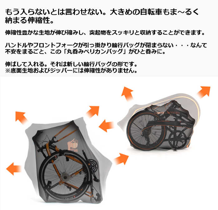 まるでペリカンが自転車を丸呑みするかのごとく、あなたの自転車をまるごと包込む輪行袋です。