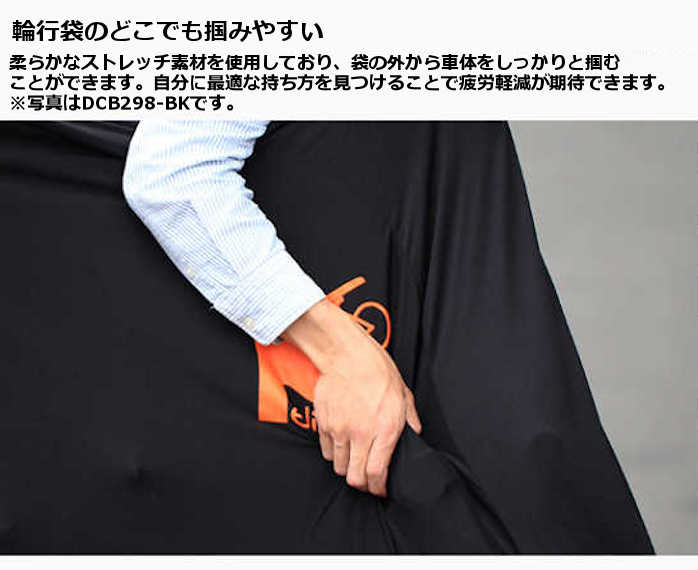 伸びる輪行バッグの一番の特徴は、その伸縮性。手強い突起物も生地を伸ばせばすっきり納まり、生地がだぶつかないから移動にも好都合です。