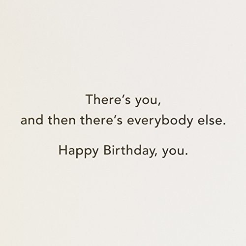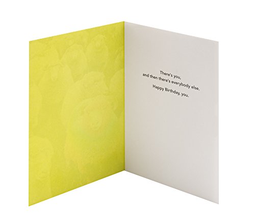 Studio : Hallmark Marketing Company, LLC (Office) Publisher : Hallmark Marketing Company, LLC (Office) Binding : Office Product Product Description Let a friend, family member, coworker, and others know how they stand out (in a good way) with this fun card featuring a rainbow-colored sheep in a herd of white sheep walking on green grass. Open the card to reveal the inside message, "There's you, and then there's everybody else. Happy Birthday, you." The card measures 7.2 inches long by 5 inches wide made with high quality cardstock paper; an envelope is included. All Hallmark cards are made with paper from well-managed forests. Shoebox greetings are the perfect way to make someone laugh out loud. These edgy, irreverent takes on life are surprising, hilarious, often inappropriate and always timely. Hallmark was founded in 1910 when 18-year-old J.C. Hall arrived in Kansas City, Missouri, with a couple of shoeboxes of postcards under his arm and the American dream in his heart. Today, more than a century later, Hallmark greeting cards are sold online and in nearly 40,000 retail stores across the globe and people continue to recognize the iconic Hallmark brand as "the very best." 0