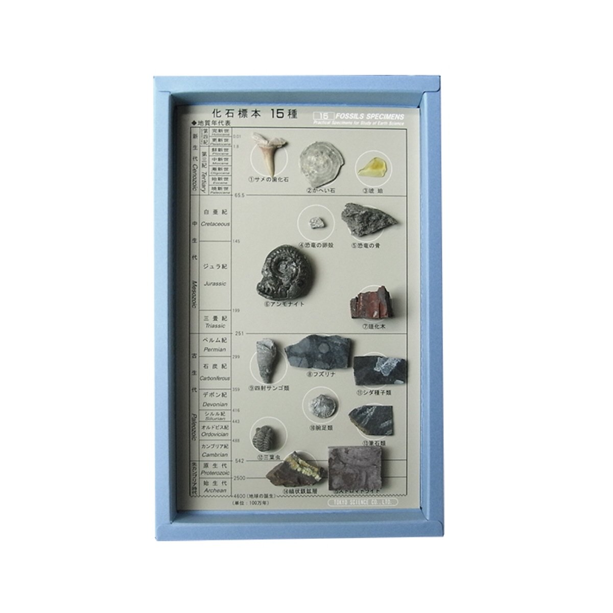Fossils stored in this specimen set (chronologically new → old): shark teeth fossil / capstone / amber / dinosaur egg shell / dinosaur bone / ammonite / silicified wood / fuzzlin / quartered coral / arms and legs
