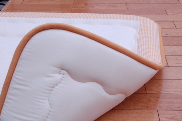 表地にはタオル地の綿生地を使用しています。綿は繊維の中でも特に肌触りが良いのが特徴で、季節を選ばずオールシーズンご使用頂けます。中材にはクッション性にこだわった国産の固綿40mmを使用しています。十分な弾力性があるのでフローリングでのご使用にも最適です。遮音特級LL-30を取得しています。床下への騒音も軽減します。また、こたつと併用するとこたつの熱を床下へ逃しにくくなるので省エネ効果もあります。