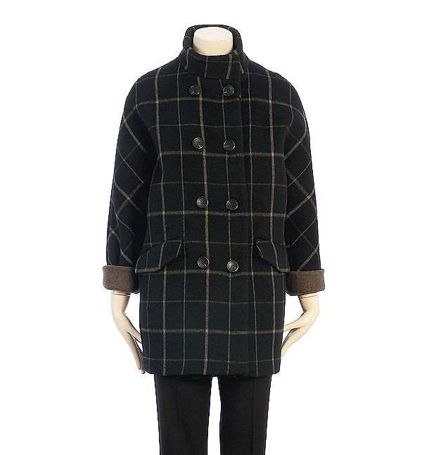 CC collect, 체크 패턴이 전체적으로 들어가있어 멋스러운 스타일 감각을 연출하는 더블버튼 코트입니다