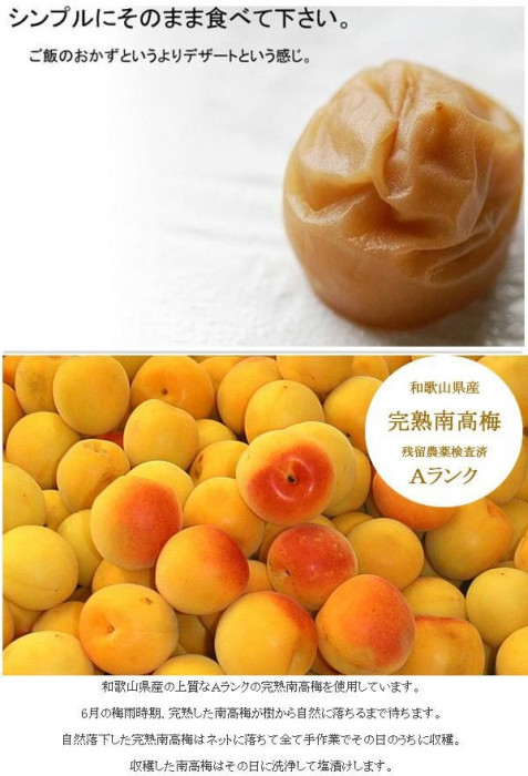 | 和歌山県産の南高梅の中でも上質な物を三代目が選別して使用。塩分6%のフルーツ感覚で食べることができる、甘い梅干し(ハチミツ不使用)です。 |