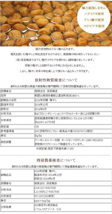 | 原材料 | 梅 、漬け原材料 (食塩、糖類(ぶどう糖果糖液糖)還元水飴)、酒精、ビタミンB1 |
