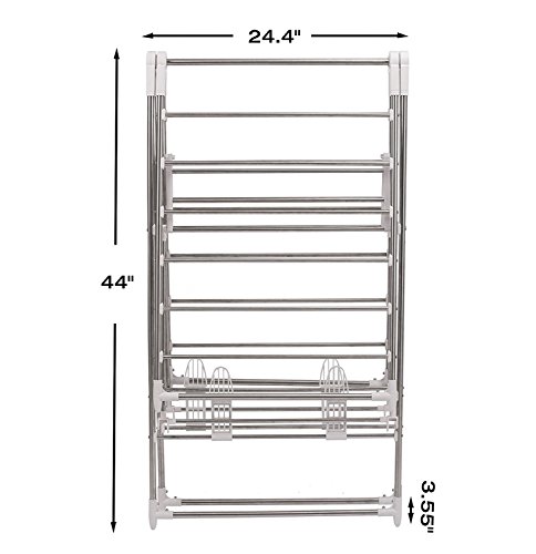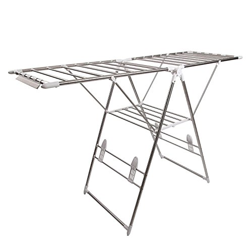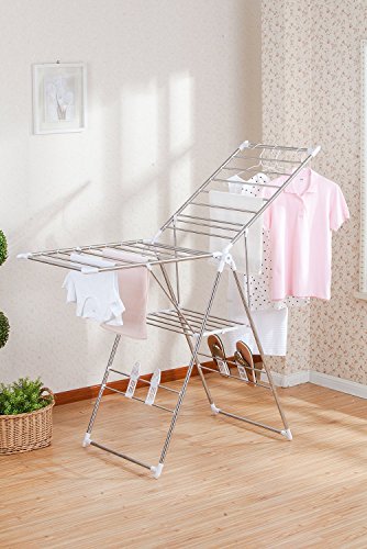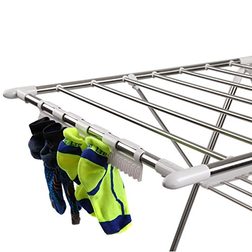 WELL DESIGN DRYING RACK: 2 wings can be adjusted in different positons for either hanging or laying flat your clothes to keep them away from wrinkling; 2 pairs of shoe holders and 2 pieces socks clips for maximum utilization; Smooth and clean surface without sharp edges protects your hands and delicate clothes