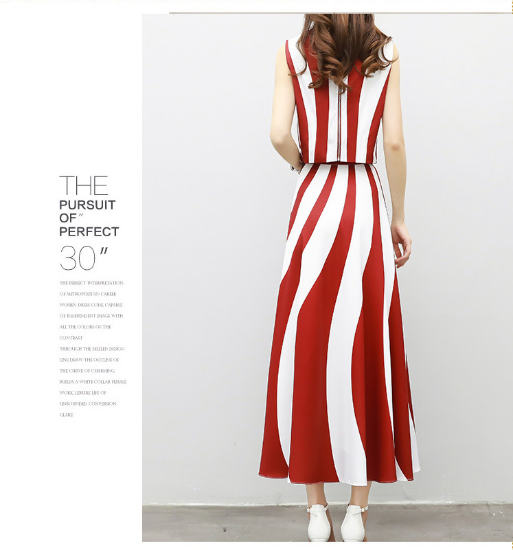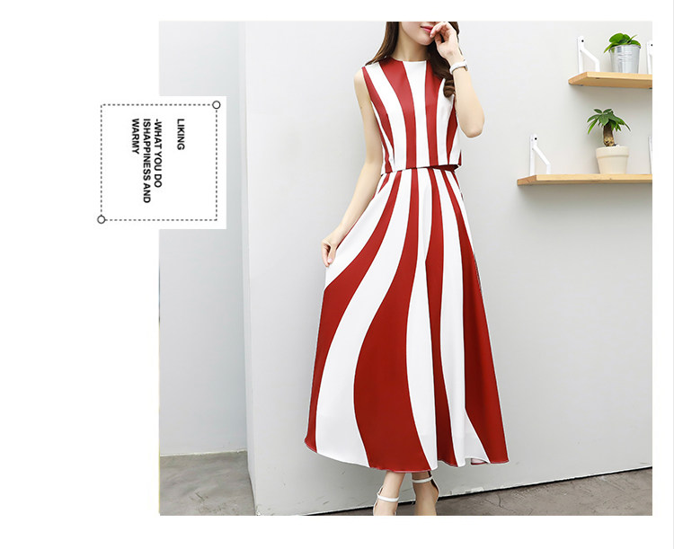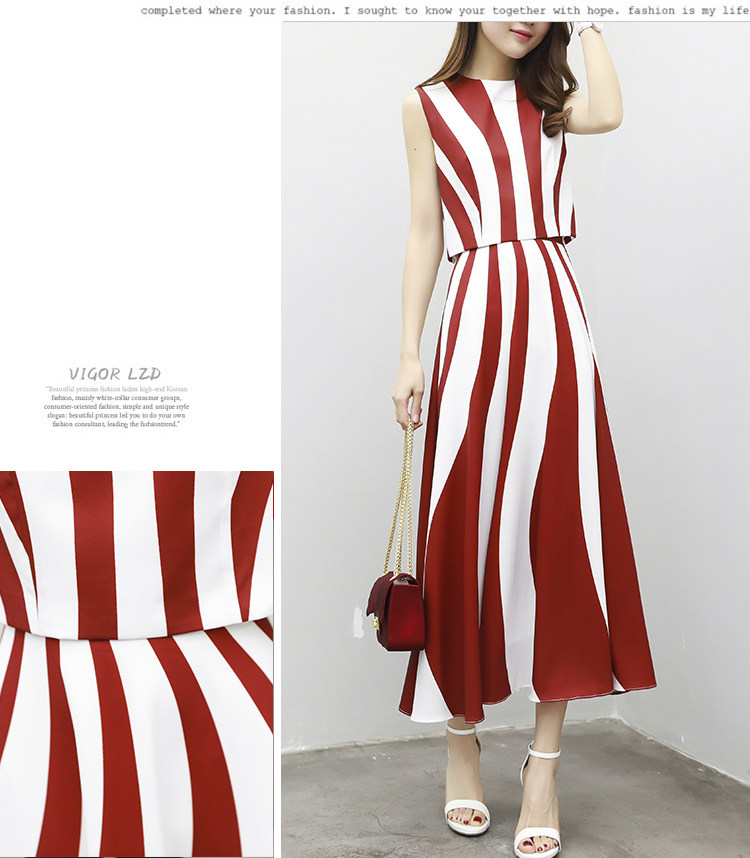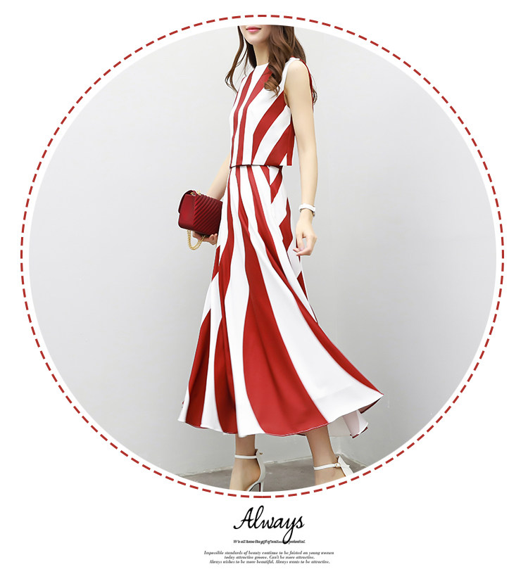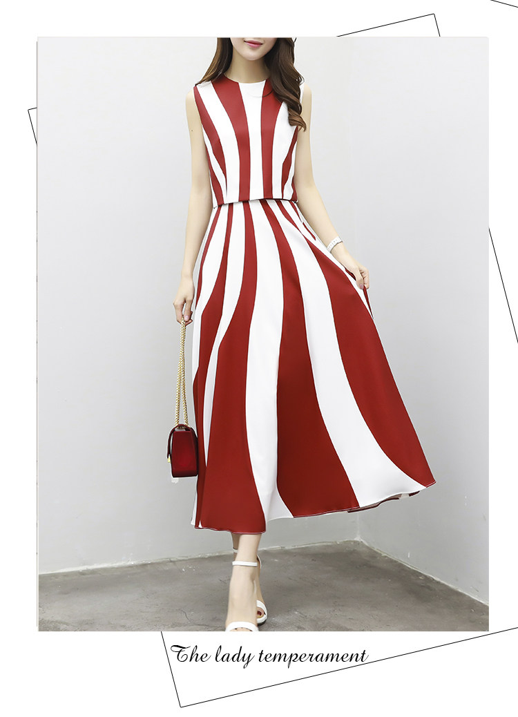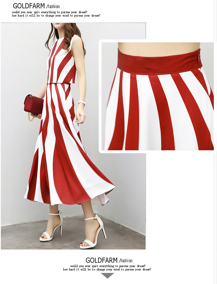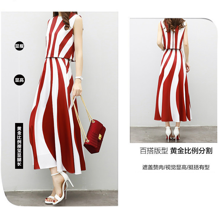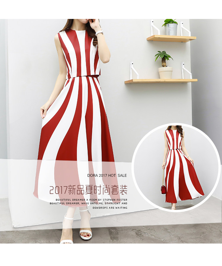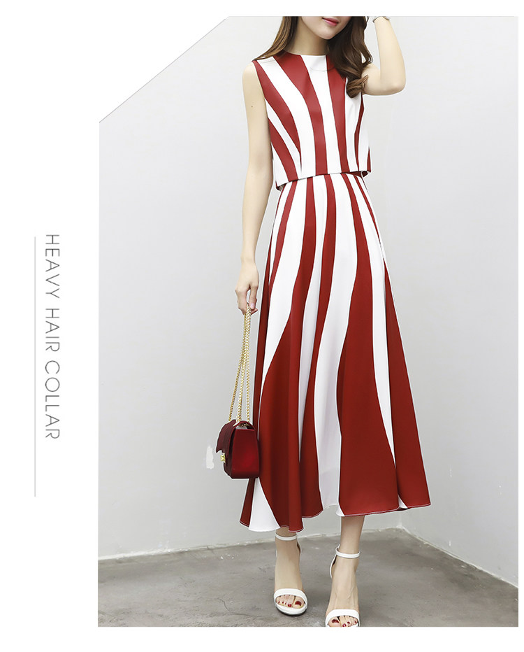 夏装2017新款女韩版修身连衣裙两件套装中长款无袖时尚条纹大摆裙