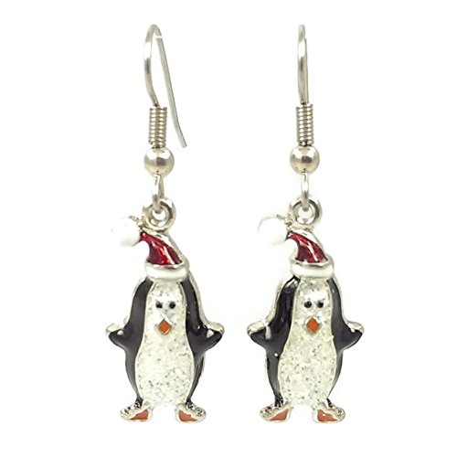 Silver-tone earrings with a fun penguin with a Santa hat. The ear wires are surgical steel. The earrings are light and comfortable. Includes a gift box. Please note that the item may be larger or smaller than it appears on your screen. Measurements are provided in the Product Specifications. Length indicates the entire length of the earring including the ear wire.Feature