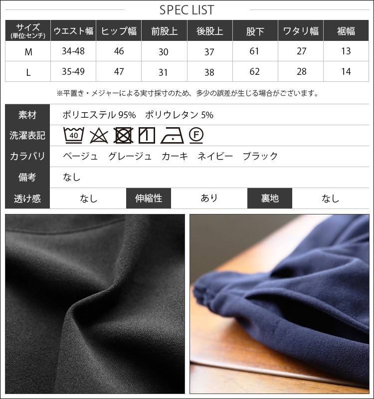M:ウエスト幅 34-48cm ヒップ幅 46cm 前股上 30cm 後股上 37cm 股下 61cm ワタリ幅 27cm 裾幅 13cm