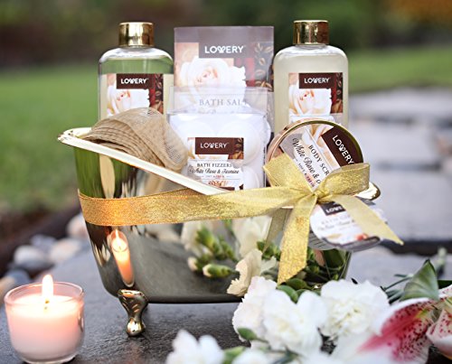 - COMPLETE SPA GIFT SET ❤ Soothe and diffuse stress with a luxurious at-home spa treatment! Beautifully packaged bath basket in a vintage gold tub, this bath gift set makes for an extraordinary gift, and adds a lovely touch to the bathroom. Contains a Shower GeL(180ml), Bubble Bath(180ml), Body Scrub(50ml), Bath Salt(100g), 6 Bath Bombs, Rose Shaped Bath Pouf Sponge, Spacious Carry Cosmetic Bag and Gold Tub to play, storage or décor.