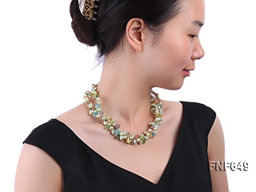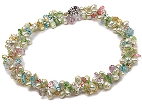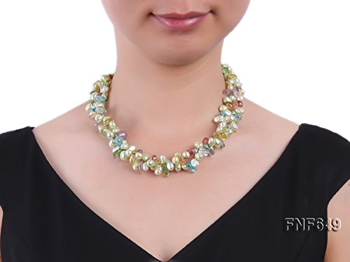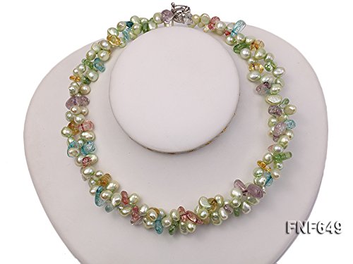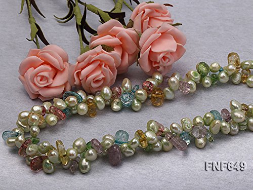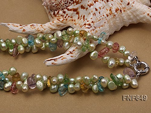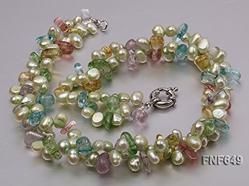 Description *This is a very pretty two-strand necklace, set with 7x8mm green side-drilled cultured freshwater pearls and baroque colorful crystal pieces.