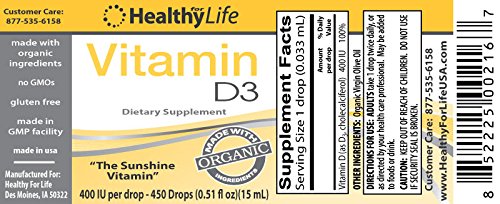 -. Binding : Health and Beauty -. Brand : Healthy Life -. EAN : 0852225002167 -. Feature : 400 IU Per Drop / 450 Drops / 15 mL / 0.51 fl oz -. IsAdultProduct : 0 -. Label : Healthy for Life -. Manufacturer : Healthy for Life -. Model : HFL-D3D -. MPN : HFL-D3D -. PackageQuantity : 1 -. PartNumber : HFL-D3D -. ProductGroup : Health and Beauty -. ProductTypeName : HEALTH_PERSONAL_CARE -. Publisher : Healthy for Life -. Studio : Healthy for Life -. Title : Healthy for Life Organic Vitamin D (D3) Drops 400 IU per drop -. UPC : 852225002167