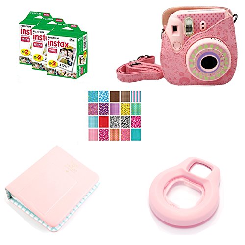 This fujifilm bundle set is perfect for your camera, specially designed for the Instax camera series from Fujifilm. Package includes: 60 sheets instax films,64 Pockets Photo Album, Pink Cartoon Instax Mini 8 Case, Pink Fujifilm Close-Up Lens,60 PCS Vivid Color Pattern Films Sticker for Fuji Instax Mini 8