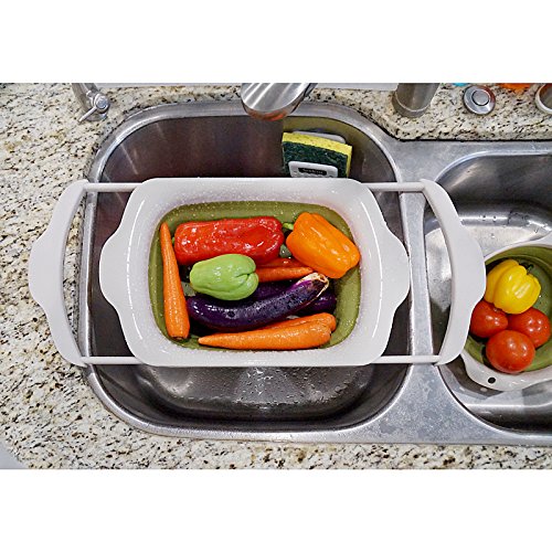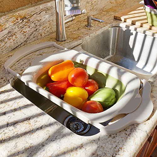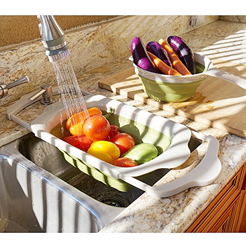 FIT MOST SINK: The handles extend so it rests over the sink and keeps it out of the bottom of the sink and water doesn't back up into the colander