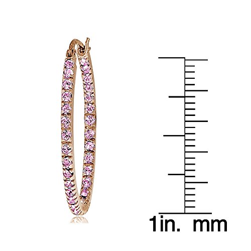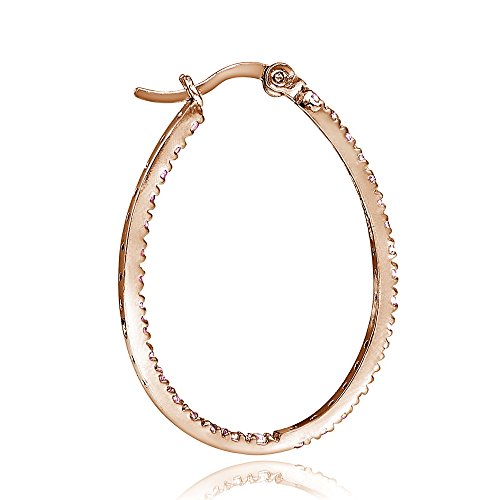 These chic oval hoop earrings feature sparkling pink CZ stones, prong-set in 30mm rose gold tone over sterling silver hoops. The stones are strategically set facing forward on the inside and outside of the hoops, so that they can be seen from the front. The hoops are secured by post with snap-down backs.