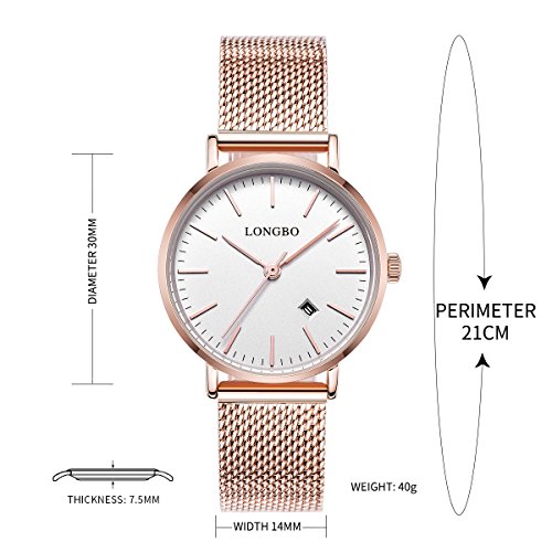 Brand, Seller, or Collection Name:LONGBO Model number:5009L_RG01 Part Number:5009L_RG01 Item Shape:Round Dial window material type:Mineral Display Type:Analog Clasp:Buckle Case material:Stainless steel Case diameter:30 millimeters Case Thickness:7.50 Band Material:Stainless steel Band length:Women's Standard Band width:15 millimeters Band Color:Gold Dial color:White Bezel material:Brass Bezel function:Calendar Calendar:Date Special features:Chronograph Movement:Japanese quartz Water resistant depth:30 Meters