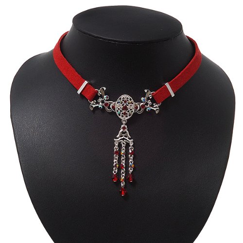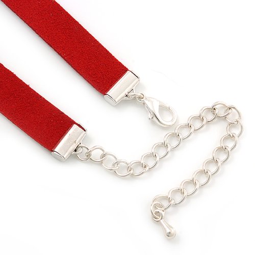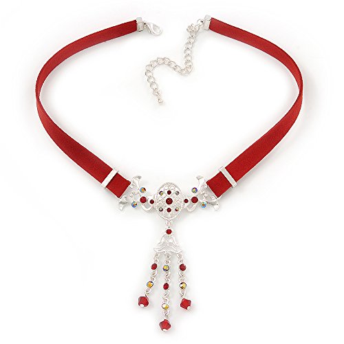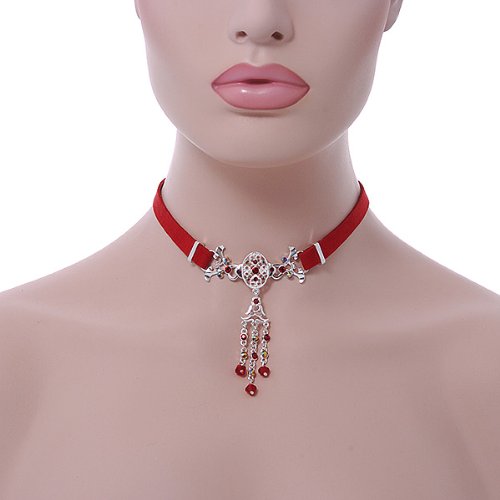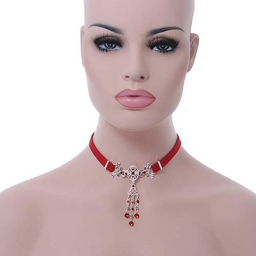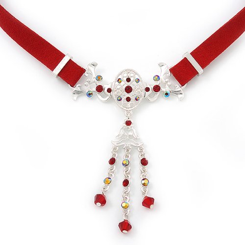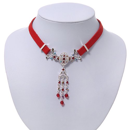 Add a touch of dramatic styling to your outfit with this fashionable Victorian Red Suede Style Diamante Choker Necklace. Featuring a choker design, made of a red suede ribbon and decorated with a Victorian style, diamante dangle in the centre. The necklace measures about 34cm in length with 7cm extension and 1cm in width, fastens with a silver tone lobster-claw clasp for a reliable fit. The dangle crafted in silver tone metal and decorated with ruby red crystals and burgundy red plastic beads, has about 8cm drop. Such an eye-catching accessory for your day and evening wear.Feature