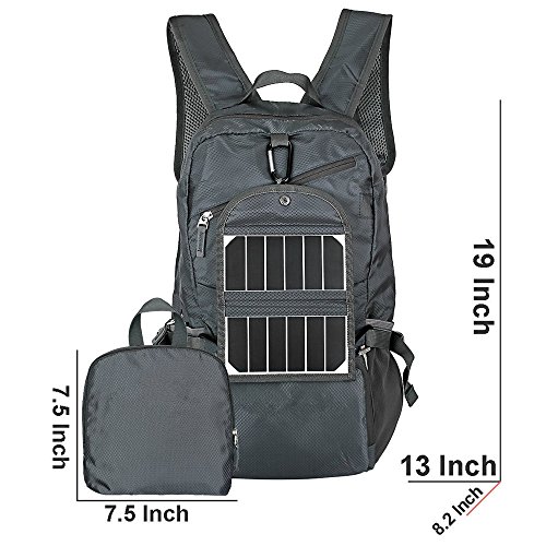 -. Feature : Durable: Made with High Quality Water and Tear Resistant Nylon material. Duarable Abrasion Resistant Metal Zipper Avaliable. Provide strengthen and long-lasting performance with minimal weight. Stress points are reinforced with bar tacking for increased longevity. Reinforced every places of seam with Bartack Process / Never Worry Cellphone out of Power when Outdoor: 3.5Watts foldable removable solar panel & 2000mAH battery charger included. SUNPOWER solar panel is 22% high efficiency which is superior than common solar panel.2000mAh battery attached solar panel storage power.Charge your device anytime you want / Light Weight (15 Oz) And Roomy (35L): Perfect for day trips, vacation, travel, day hikes, school, camping and shopping / Packable Compact Design: Easy to folds up into small pocket. You can easily pack it in suitcase,for use at their destination as an extra bag for the trip / Keep Things Organized: Main pocket is large enough to carry what you need, iPad, book, clothes, camera and snack. Outer smaller pocket great for quick access such as guide books and towel. Abover zippered pocket perfect for your cell phone and charging cable. Two large side mesh pockets for water bottles or umbrella