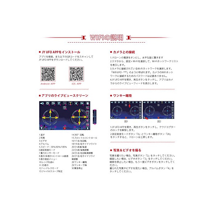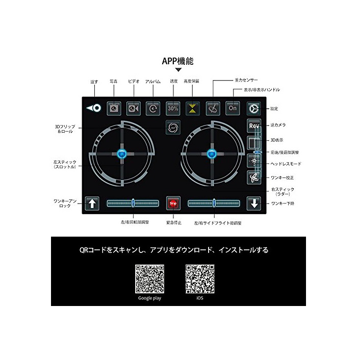 고도 유지 기능:기압 센서에 의한 고도 유지 기능에 덧붙여,자동《호바린구》제어가 실현에 옵니다.상세한 일본어 설명서 부착.접이식식 암 부착에,운반이 용이합니다.