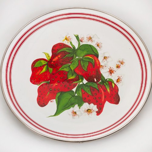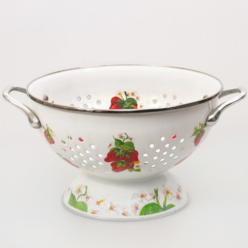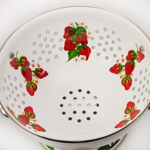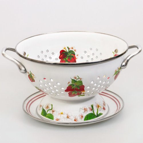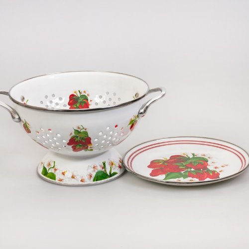 -. Brand : Golden Rabbit -. Feature : Made in: Indonesia by Golden Rabbit / Material: Enameled Steel / Set Contains: 1 colander, 1 tray / Capacity of Colander - 32 fl oz (900 ml); Diameter of Tray - 7.9'' (20 cm) / Dishwasher-safe. For use in the oven, on the stove or under the boiler. -. ProductGroup : Kitchen -. ProductTypeName : KITCHEN -. Title : Enameled Colander and Tray Set "Strawberry"