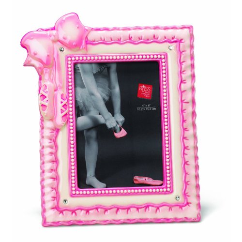 -. Feature : Ballet Frame with 4-Inch by 6-Inch photo opening / Ceramic frame, glass insert and velvet flocked back / Embossed ballet shoes in the corner with rhinestone accents / Decorative