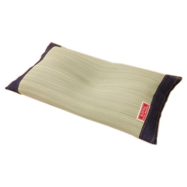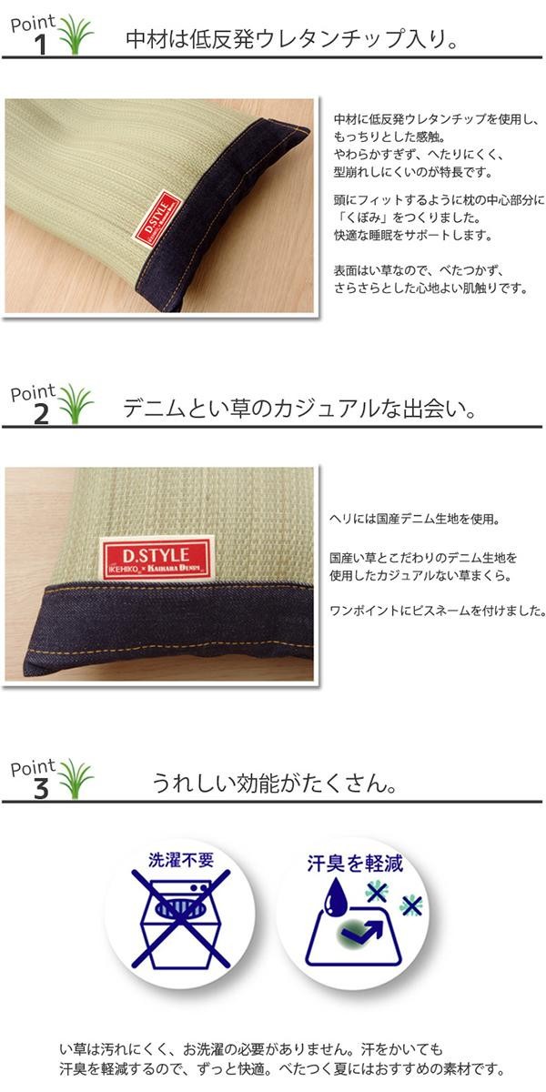 より頭にフィットするよう、枕の中心部分に「くぼみ」をつくりました。国産のしなやかない草を使用していますので、柔らかくすべすべとした肌触りです。い草には抗菌・防臭効果のある青森ヒバ加工を施しています。中材には低反発ウレタンチップを使用しており、柔らかすぎずヘタリにくく、型崩れしにくいのが特長です。 |