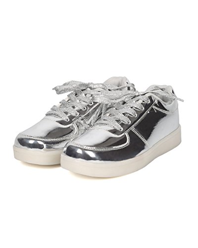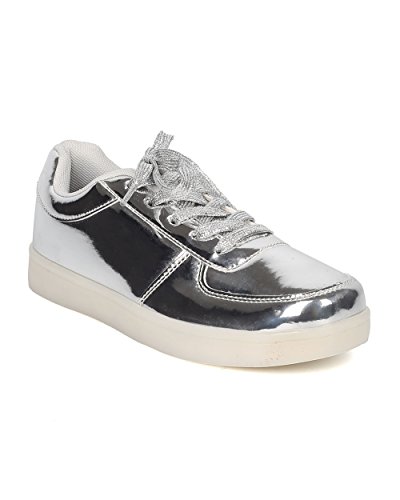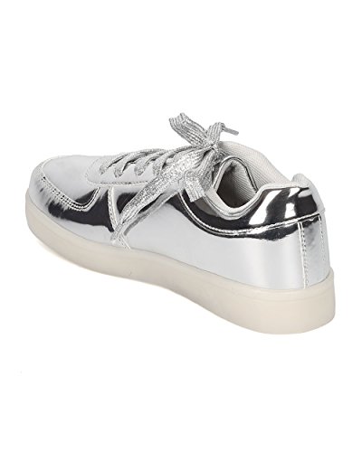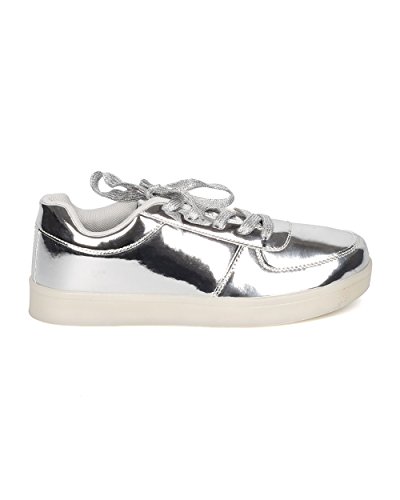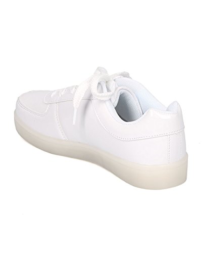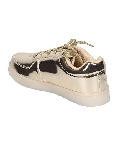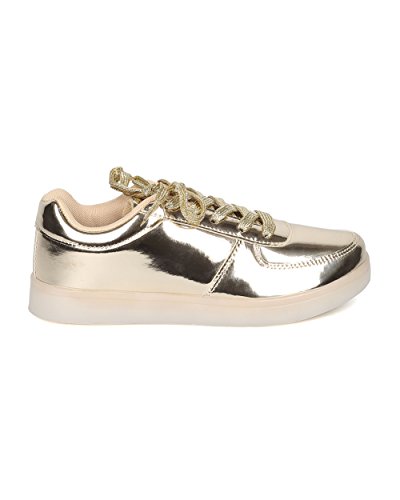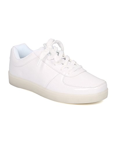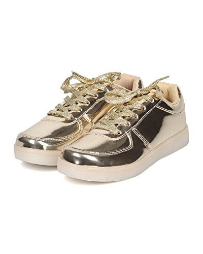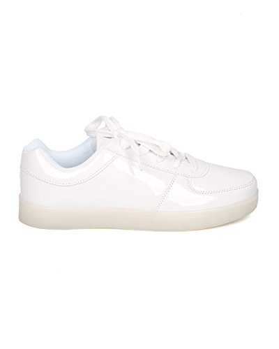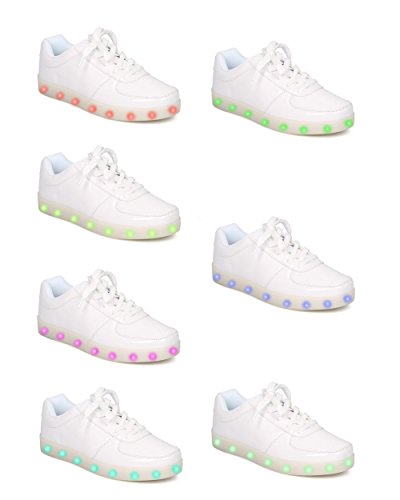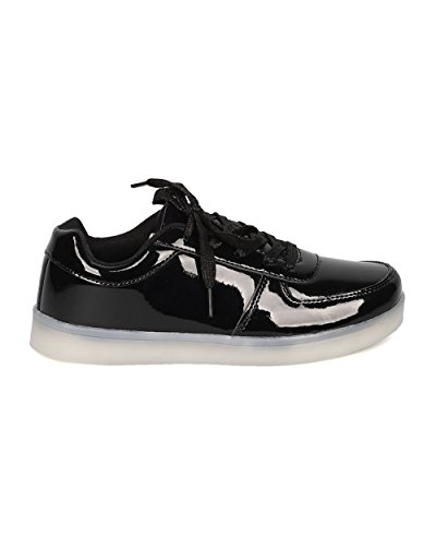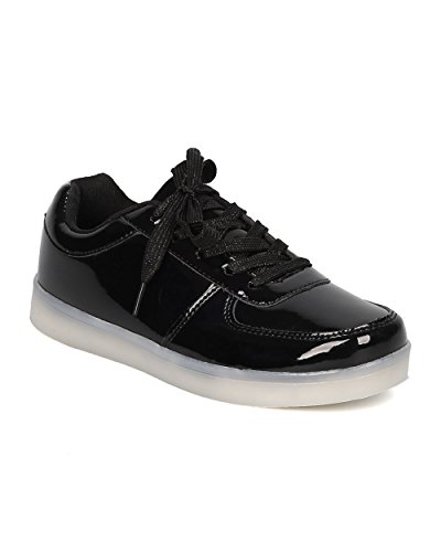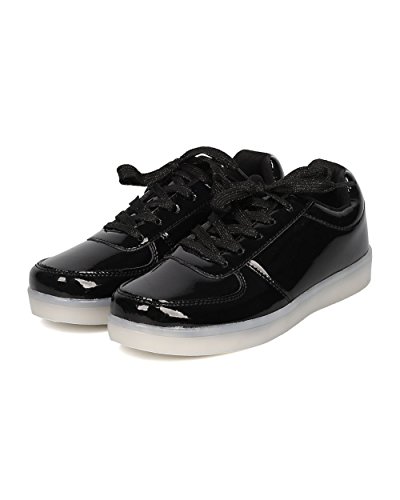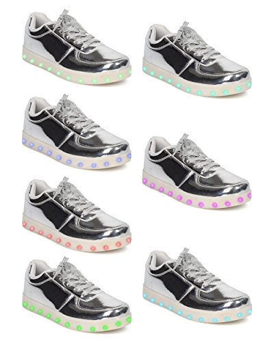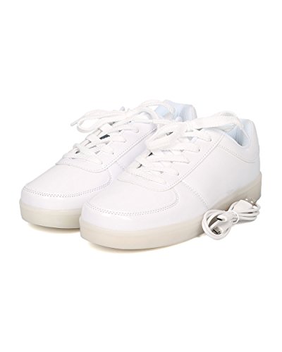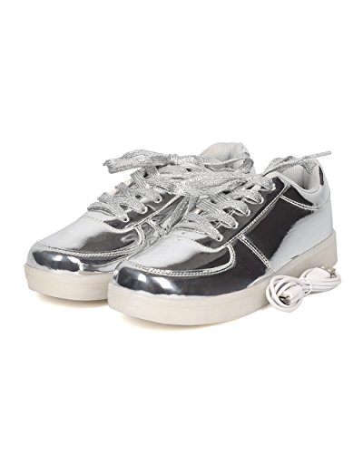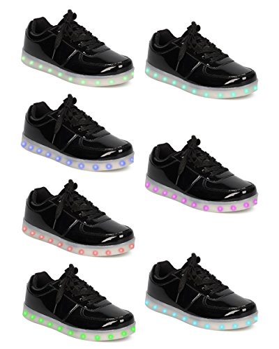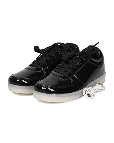 Product Description These rechargeable sneakers are made with a patent leatherette upper and lace up front. Also made with light up soles with adjustable colors, and USB charge cord. 0