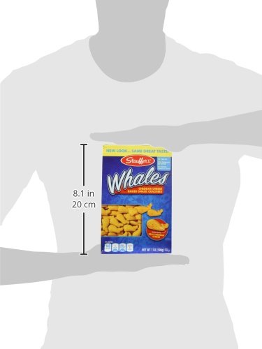 -. Feature : Stauffer's Whales Baked snack crackers with real cheddar cheese / 0 g trans fat / 0 mg cholesterol per serving 35 crackers only 100 calories / no artificial flavors or colors low sugar / Whale trivia on box