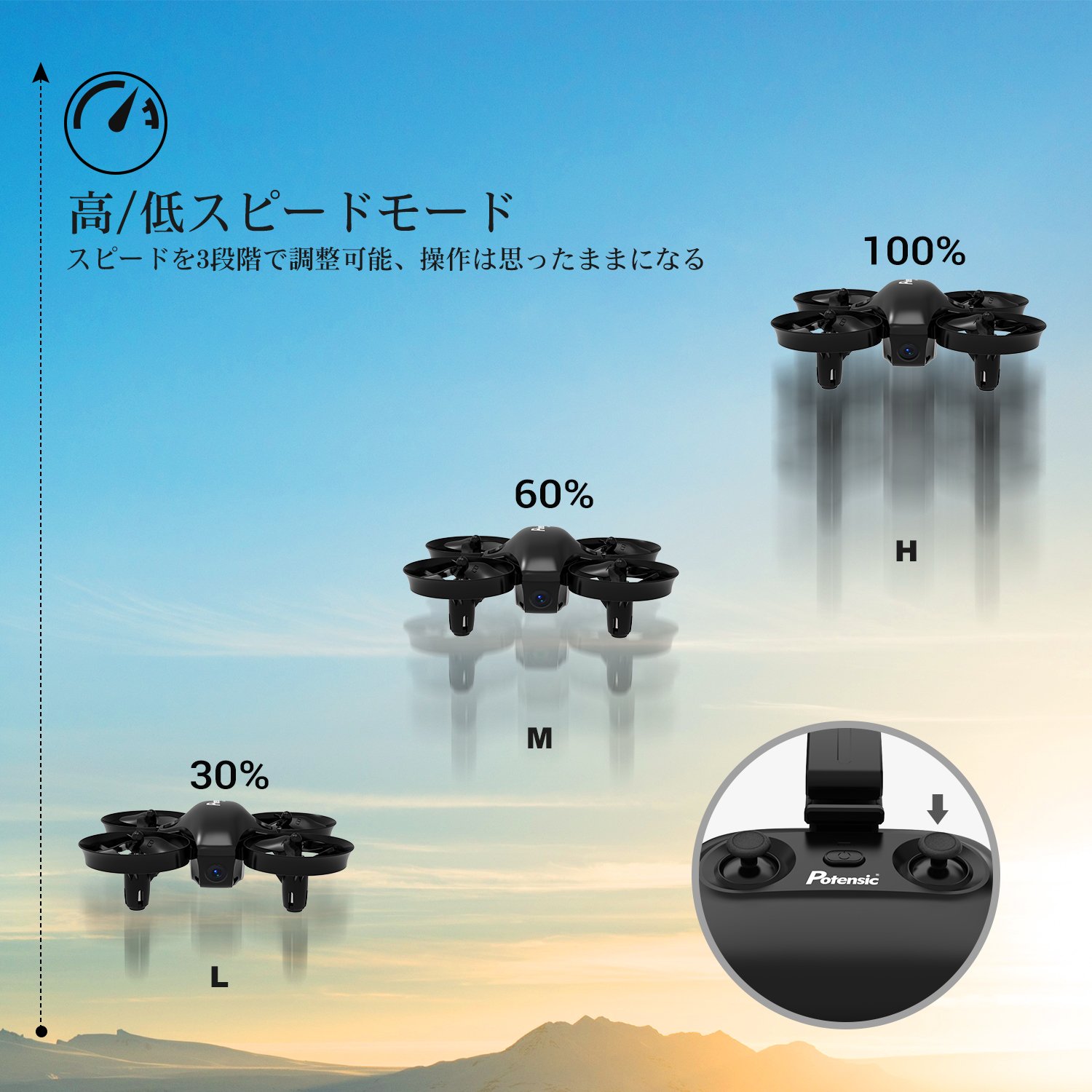 【ヘッドレスモード&3段階速度調整】ヘッドレスモードで簡単操縦!ヘッドレスモードでドローンを操縦すると、ドローン視点ではなく、操縦者視点で前後左右を判断することになる。高速/中速/低速の速度調整可能、初心者からプロまで最適です。