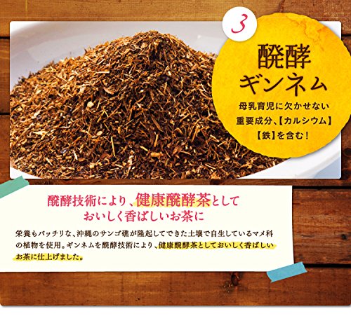 ウーロン茶の約50倍ものカルシウム、鉄などのミネラルを含む醗酵ギンネムと、妊娠中・産後の体型維持にうれしい黒豆をブレンド。