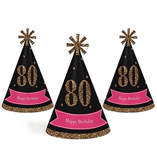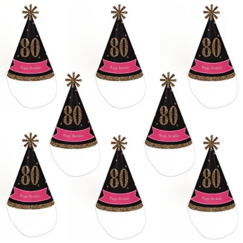 -. Title : Chic 80th Birthday - Pink, Black and Gold - Cone Happy Birthday Party Hats for Kids and Adults - Set of 8 (Standard Size)