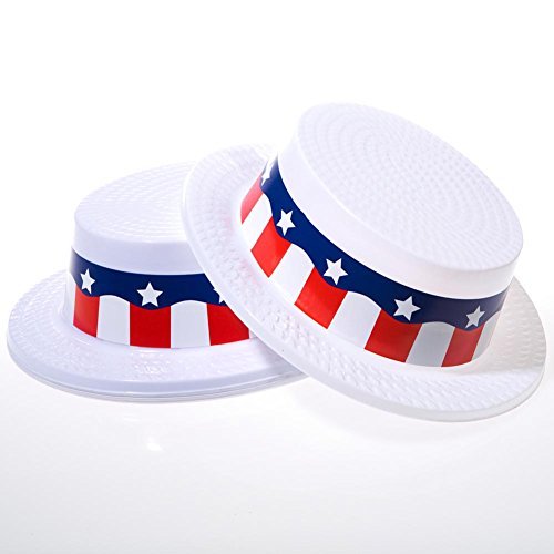 -. Feature : One pack of 12 / One size fits most, approximately 22″ around the inside / White hats with patriotic hat bands / Made of plastic